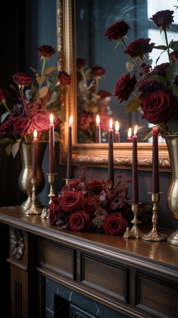 Layer burgundy roses, black candle holders, and dark-stained wood décor. A vintage mirror or antique gold piece adds richness without breaking the mood.