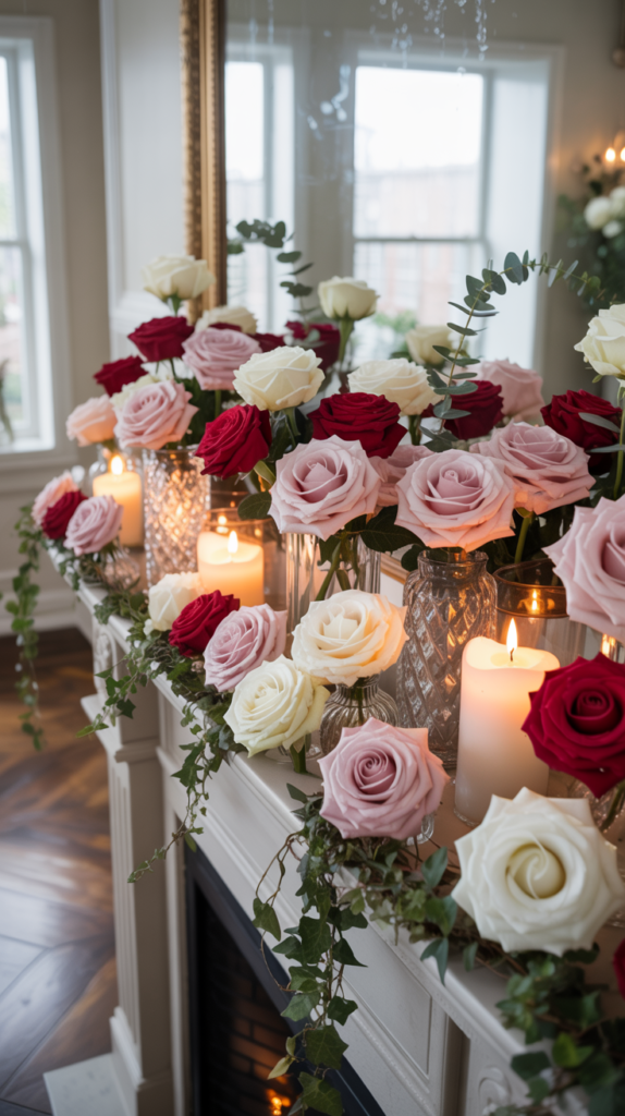 Roses are the heart of Valentine décor. A mantel overflowing with rose arrangements—real or faux—creates a dramatic and romantic statement. Mix pinks, reds, and whites for dimension.