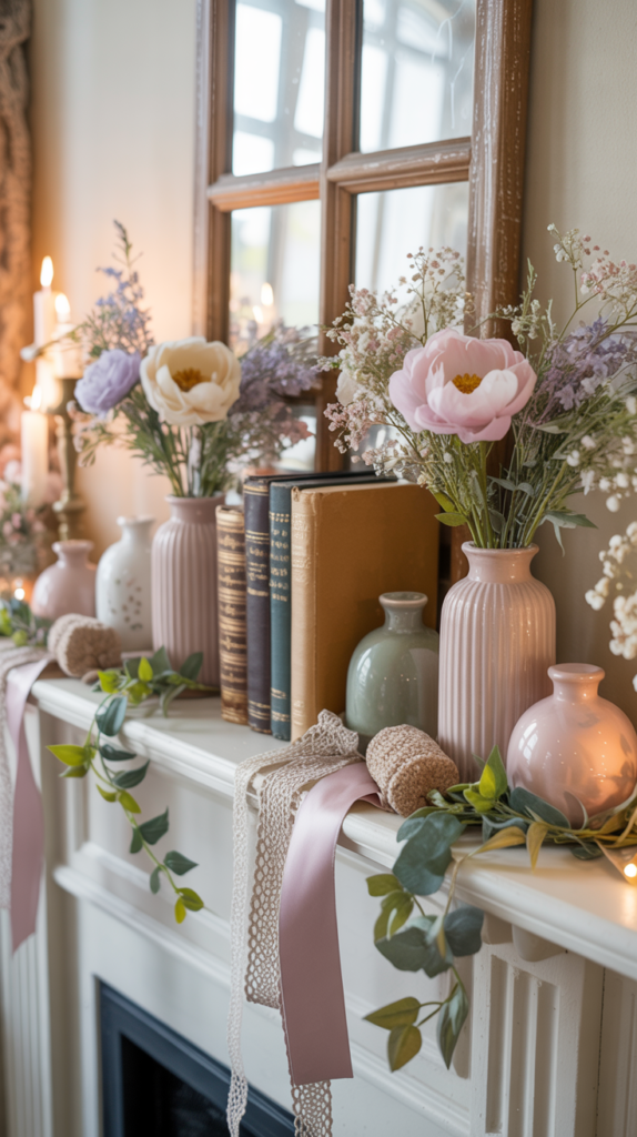 Choose pastel pinks, lavender, pale yellow, and sage green. Add small bouquets in mismatched vases and complete the look with a soft floral garland draped loosely across the mantel.