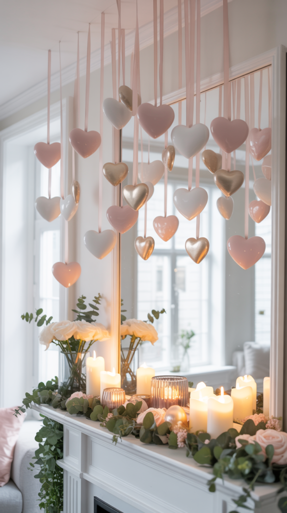 The charm comes from the movement and height they add. Hearts hung from ribbons, twine, or clear string look light and airy, especially when paired with candles or florals below. You can hang them from a mirror, the mantel edge, or a garland for extra dimension.