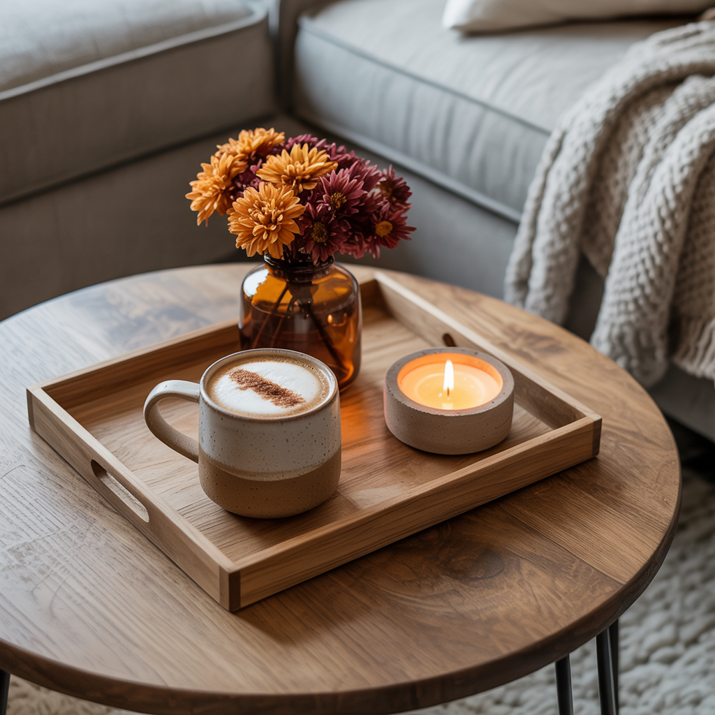 Hear me out: a rustic tray isn’t just for carrying snacks. It’s the ultimate “cozy clutter organizer.” You know how random remotes, candles, and mugs end up everywhere? A tray makes them look intentional.