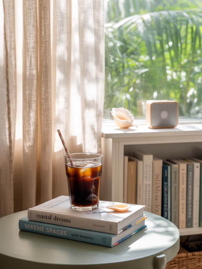 Corner shelf styled with a large cascading pothos plant in a textured white ceramic planter, stacked “Coastal Dreams” books, a framed ocean photo, and a glowing ivory candle. Natural daylight streams through a nearby window, casting soft shadows and highlighting the lush green leaves. Cozy, summer-ready, and styled with warm coastal charm.