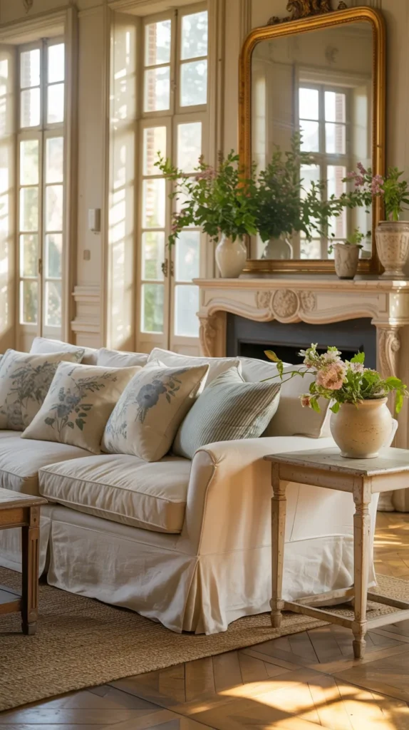 Nothing says French country living room faster than a relaxed linen slipcovered sofa. The key is that it shouldn’t look stiff or tailored — the slight wrinkles and soft drape are exactly what make it feel authentic. French interiors lean into comfort over perfection, so an ivory, flax, or warm oatmeal sofa instantly creates that lived-in European softness. When the fabric moves naturally and doesn’t cling tightly to the frame, the room immediately feels calmer and more welcoming.