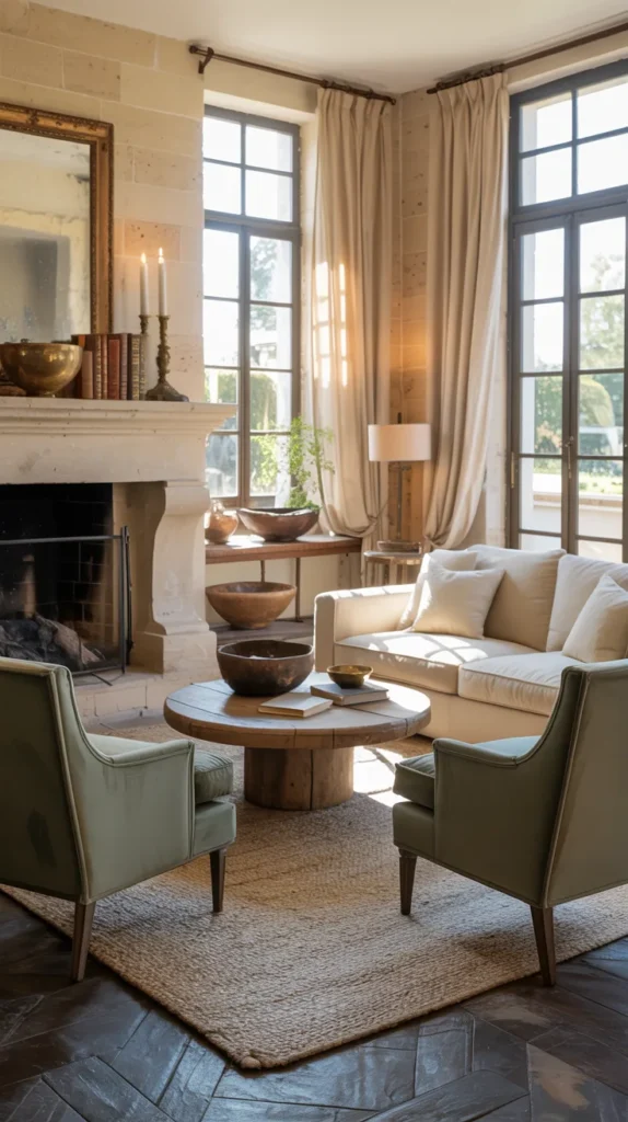 Unlike modern layouts where furniture hugs the walls, French country rooms are arranged for living. Seating is pulled inward to create a conversation grouping — chairs angled toward each other, a sofa facing the fireplace, and a table within reach of everyone. The space feels intimate even if the room is large.