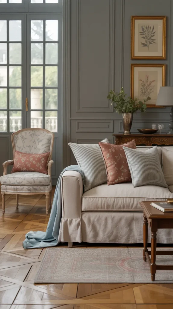 French country interiors always include gentle pattern — especially ticking stripe fabrics. Thin stripes, small florals, and understated prints bring life to seating without overwhelming it. When pillows vary slightly in scale and tone, the room feels collected rather than decorated.