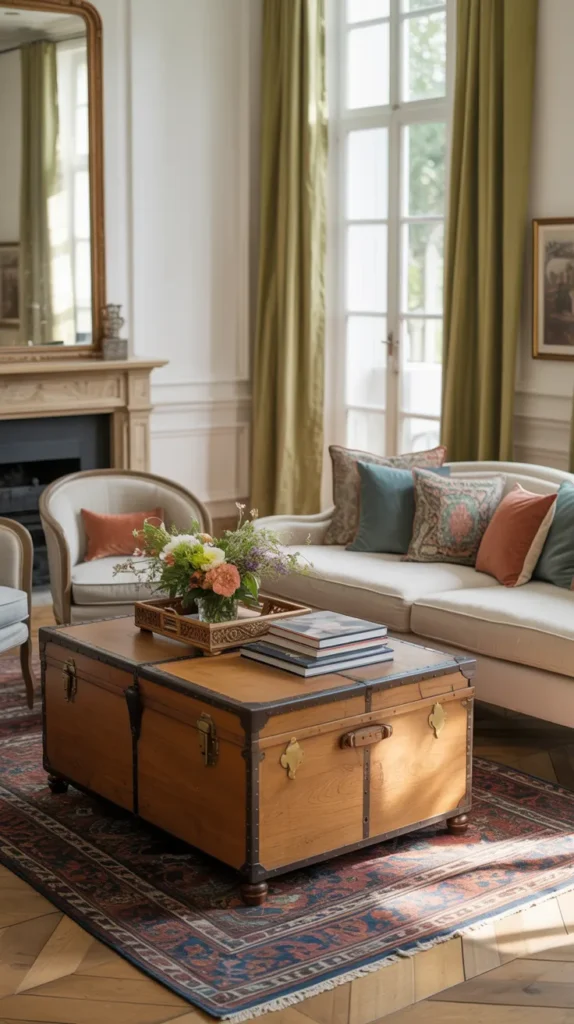 A French country living room almost always includes something that feels storied, and a vintage trunk does this instantly. Whether it’s leather, wood, or painted, it brings personality a standard table can’t. Scratches, worn corners, and patina make the space believable rather than decorated.