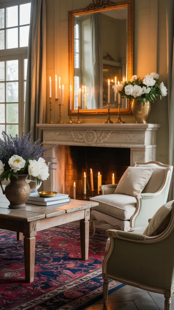 Instead of heavy styling, designers keep the mantel minimal so the material can breathe. A gilded mirror, small artwork, or a few candlesticks are enough. The fireplace should feel like part of the home’s history rather than a decorated surface. The imperfections are what make it beautiful — symmetry is less important than authenticity.