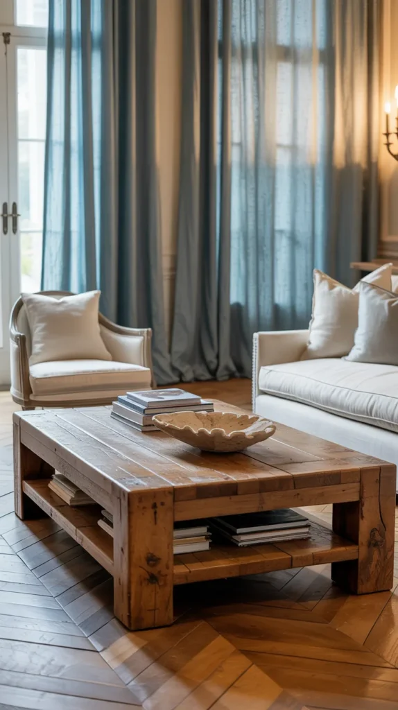 A French country room almost always centers around a weathered wood coffee table. Unlike modern glossy finishes, this style embraces visible grain, uneven color, and softened edges. The more natural and aged it looks, the more believable the space feels. Reclaimed oak, farmhouse planks, or chunky pedestal tables all work because they add weight and history to the middle of the room.