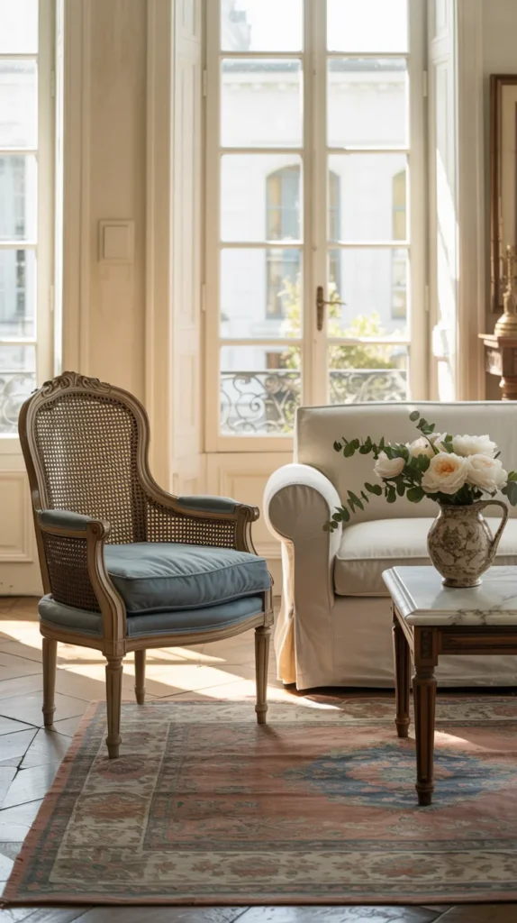 French country style always includes at least one piece that feels a little refined, and that’s usually a Louis-style armchair. The curved wood frame and soft upholstery add elegance without making the room formal. What makes it work is contrast — placing a delicate silhouette next to a relaxed sofa keeps the space from leaning too rustic or too polished. Cane backs, faded blue linen, or soft floral fabric all give that gentle European charm.