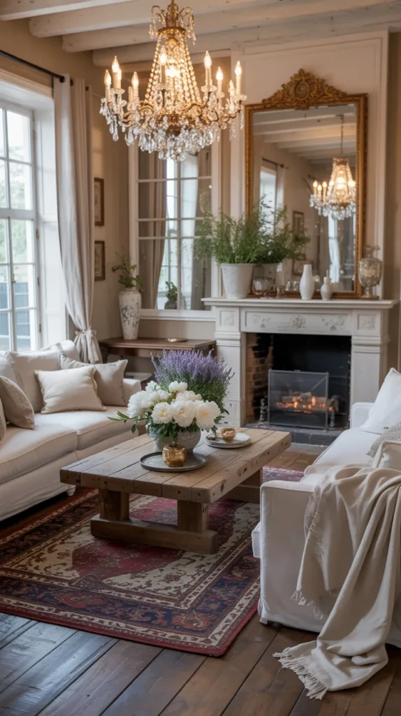The real formula behind this style is balance. Every French country living room pairs something rough with something graceful — a chunky table with delicate seating, or plaster walls with a crystal chandelier. Without that contrast, the room either feels heavy or overly decorative. Designers intentionally layer rustic materials and refined silhouettes so neither dominates.