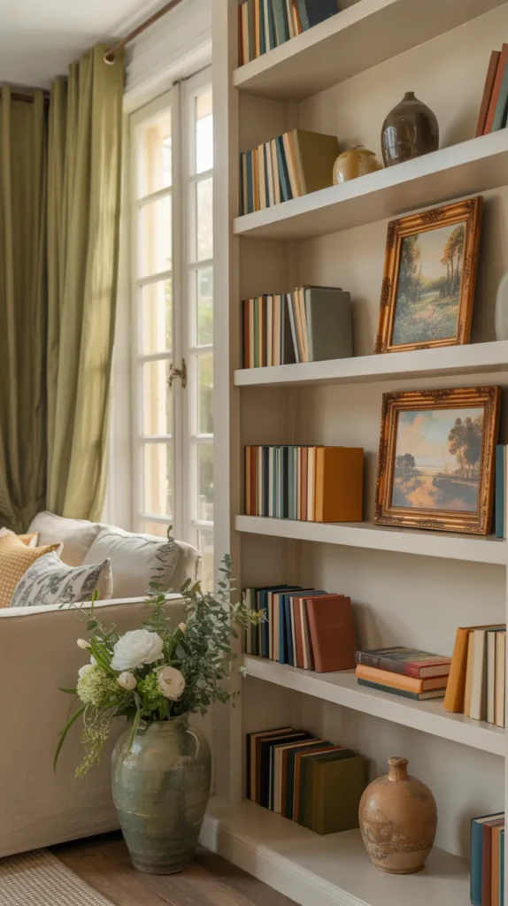 The secret is variety within a calm palette. Mixing ceramics, artwork, and greenery keeps the eye moving while maintaining softness. Designers avoid empty expanses and instead create gentle abundance. The shelves should feel like they’ve grown over time, not styled in one afternoon. That quiet fullness is what makes the room feel lived-in and welcoming.