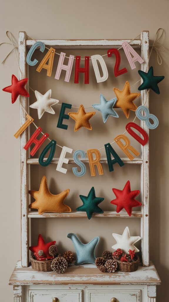 Handmade felt decorations bring a cozy touch to your cottage Christmas decor. The image showcases a charming display of colorful felt stars and letters, perfect for adding a personal flair to your holiday setup.