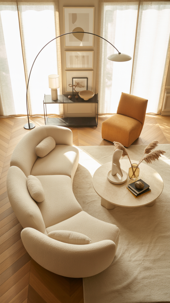 curved sofa instantly softens the energy of a living room, making it feel more welcoming, organic, and contemporary. Unlike boxy or angular furniture, curved silhouettes create visual movement that feels fluid and natural rather than rigid. Pairing this with an armless accent chair enhances the sense of openness, allowing the space to breathe while maintaining a clean, modern aesthetic. This combination is especially beautiful in open-concept layouts, where furniture placement plays a major role in how a room feels.