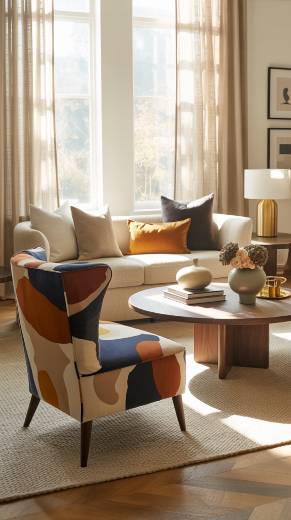6) Neutral Sofa + Patterned Armchair — Personality Without Chaos