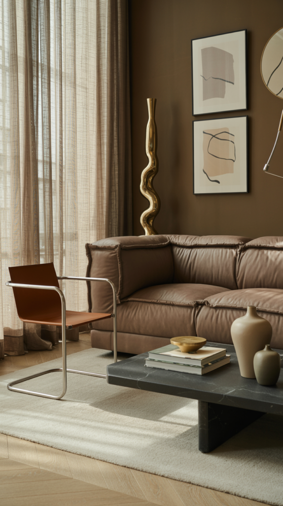 plush taupe sofa offers softness, warmth, and understated luxury, making it the perfect foundation for a modern living room. Its neutral tone feels calming and versatile, working seamlessly with a variety of decor styles. Pairing it with a chrome tubular accent chair introduces a sleek, futuristic edge that contrasts beautifully with the sofa’s softness. The shiny metal frame adds lightness, reflection, and visual interest, preventing the space from feeling too heavy or monotone.