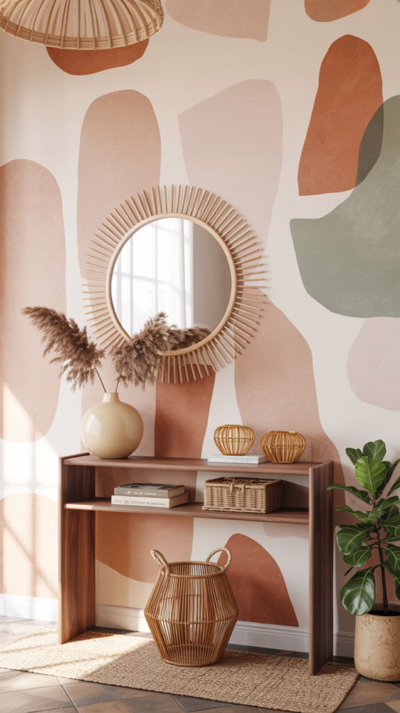 This style works especially well in living rooms, bedrooms, or home offices where you want a creative yet relaxed atmosphere. When paired with layered rugs, textured pillows, and warm wood furniture, abstract boho wallpaper becomes the perfect backdrop for a space that feels both stylish and soulful. It adds personality without overpowering the room, which is why it’s so popular in Pinterest-worthy boho interiors.
