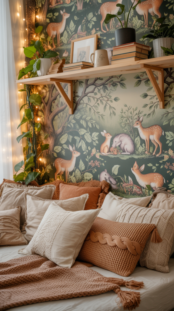 In a bedroom or reading nook, forest witch wallpaper creates a cozy, cocoon-like feeling that makes the space feel safe and enchanting at the same time. Add candles, plants, soft blankets, and warm lighting, and the room becomes a little escape from the outside world. It’s the kind of wallpaper that makes you feel calm, inspired, and quietly magical.