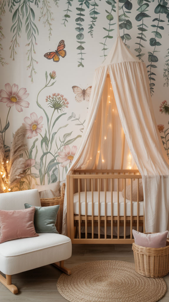 What makes woodland boho wallpaper so enchanting is the sense of calm it brings. Instead of overstimulating patterns, it creates a soft visual rhythm that feels safe and soothing. Paired with natural wood furniture, soft blankets, and warm lighting, the room becomes a little forest retreat for your child. It’s a timeless look that grows with them — sweet for a baby, but still beautiful as they get older.