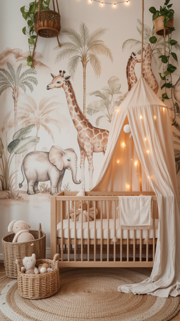 Blush safari boho wallpaper is such a beautiful way to bring playful charm into a nursery without making it feel overly childish. Instead of bright, cartoonish animals, these designs feature soft elephants, giraffes, and palm trees painted in blush, cream, and warm beige tones. The result feels gentle, cozy, and chic — like a baby’s room that still fits into a stylish boho home. It creates a sweet, nurturing atmosphere that feels calming for both baby and parents, especially when paired with light wood furniture and soft textures.