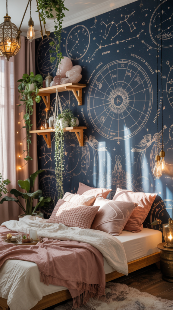 What really makes celestial boho wallpaper special is how it adds meaning to your space. Moons and stars have always symbolized intuition, femininity, cycles, and dreaming — which fits beautifully with the boho spirit. Even a small accent wall can make a room feel more personal and soulful, especially if the rest of your decor is simple and cozy. Add a few crystal accents, gold-framed mirrors, or soft linen pillows, and suddenly your room feels like a boho goddess hideaway. It’s the kind of wallpaper that makes people stop and stare, but still feels soft, warm, and inviting instead of overwhelming.