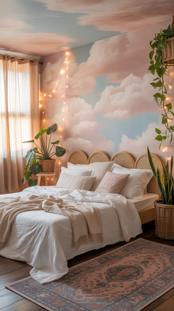 Boho cloudscape wallpaper feels like sleeping under an open sky. These designs feature soft, painted clouds drifting across blush, cream, or pale blue backgrounds, creating a light, airy feeling that instantly softens a room. It’s dreamy without being childish — more like a gentle watercolor wash across your walls. In boho spaces, it works beautifully because it adds movement and softness without overwhelming the decor.
