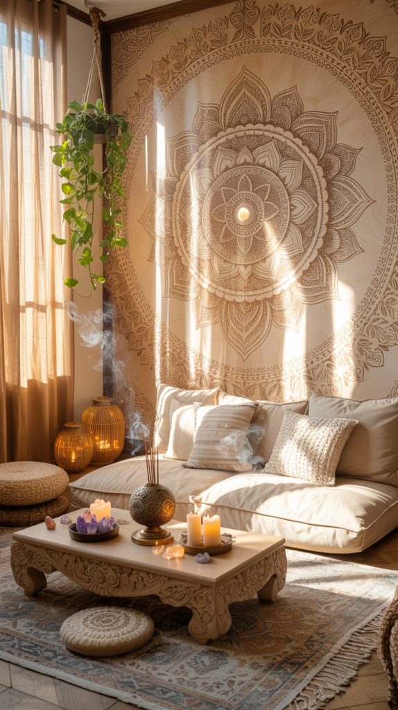 In a bedroom or meditation space, this wallpaper creates a feeling of gentle protection and comfort. Paired with layered bedding, plants, and soft lighting, the room starts to feel like a cozy bohemian cocoon. It’s perfect if you love decor that feels spiritual, comforting, and a little bit magical, turning your space into somewhere you truly want to unwind.