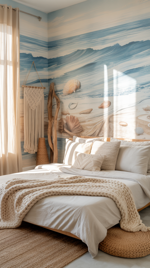Ocean wave boho wallpaper brings a peaceful, flowing energy into a nursery or bedroom. Soft rolling waves, shells, and sea-inspired details in sandy beige, muted blue, and soft white tones make the room feel light and open. It’s like bringing the calm of the beach indoors, creating a space that feels fresh, airy, and relaxing. This style works beautifully in boho homes because it blends natural beauty with gentle, artistic design.