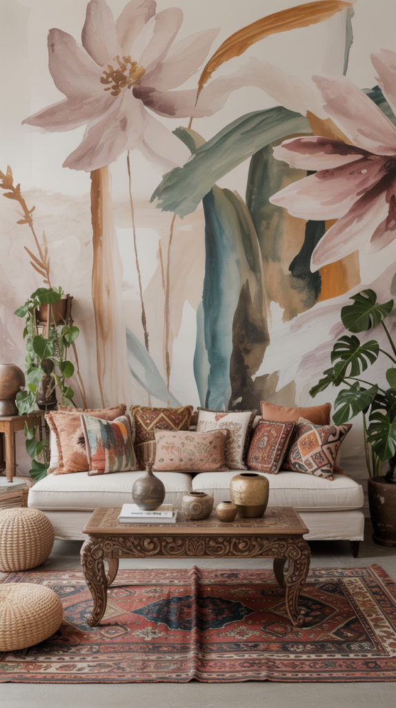 This type of wallpaper is perfect for people who want their home to feel expressive and personal. Pair it with neutral furniture, layered rugs, and cozy textiles, and the mural becomes a stunning backdrop that never feels overwhelming. Whether you use it behind a bed, a sofa, or in a creative corner, hand-painted boho wallpaper adds depth, emotion, and artistic charm that you just can’t get from plain walls.