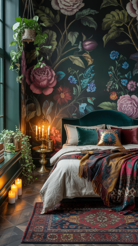 What makes this style so enchanting is how it instantly transforms the atmosphere of a room. Add warm lighting, gold accents, velvet pillows, and layered textiles, and the space starts to feel like a high-end boho boutique hotel. Even simple furniture looks more expensive against a dark floral wall, which is why this wallpaper is such a favorite for statement spaces. It’s bold, soulful, and deeply cozy — the perfect mix for modern boho lovers.