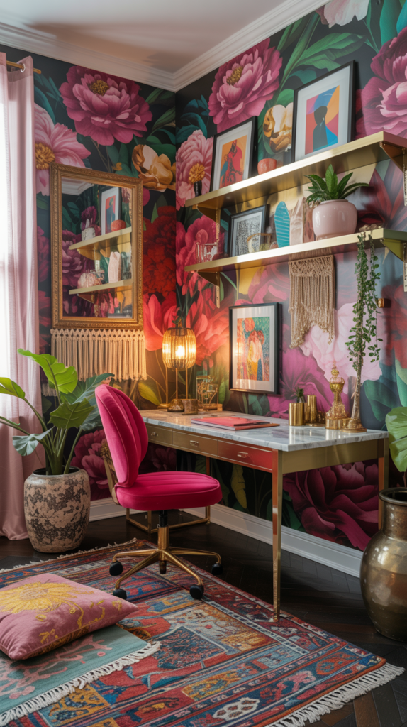 For creators who love color, pattern, and expressive decor, maximalist feminine design is a joyful option. Think bold florals, layered textures, stylish clutter, and vibrant color mixes. A maximalist workspace feels full of personality and inspiration — perfect for artistic work.