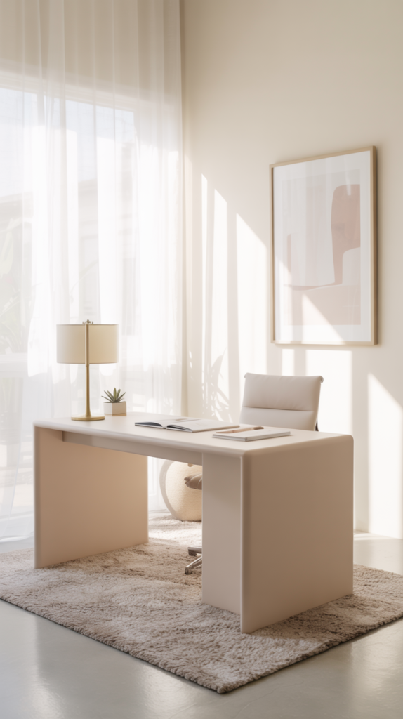 Minimalist feminine design focuses on clean lines, soft tones, and clutter-free surfaces. This style is ideal for anyone who prefers a calm workspace that feels open and peaceful. The key is intentionality — choosing fewer, high-quality pieces that elevate the whole room.