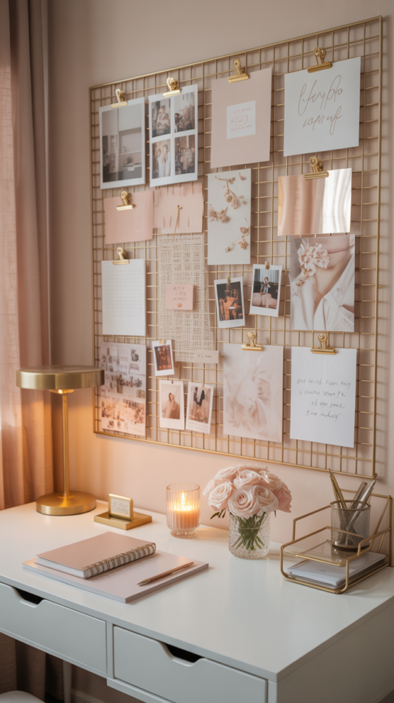 A mood board wall is both a creative tool and a stunning piece of decor. Use cork boards, gold grids, or framed prints to display quotes, vision photos, fabric swatches, or anything that inspires you. This becomes a living reflection of your goals and creativity.