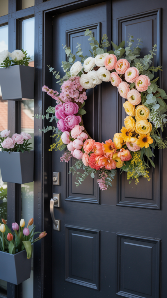 Tulips are one of the most iconic flowers of spring, and when they’re mixed together in a rainbow of colors, they create a front door moment that’s impossible to ignore. A tulip rainbow wreath features shades of blush, coral, yellow, white, lavender, and even deep pink, all woven together to form a full, colorful crown. It feels fresh, vibrant, and incredibly joyful — the kind of wreath that makes people smile the second they see it.