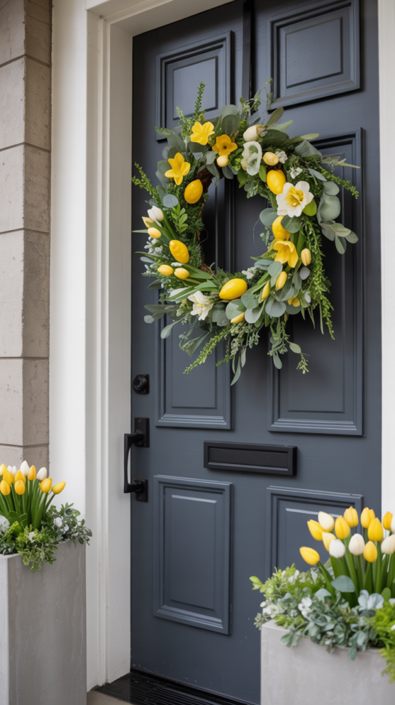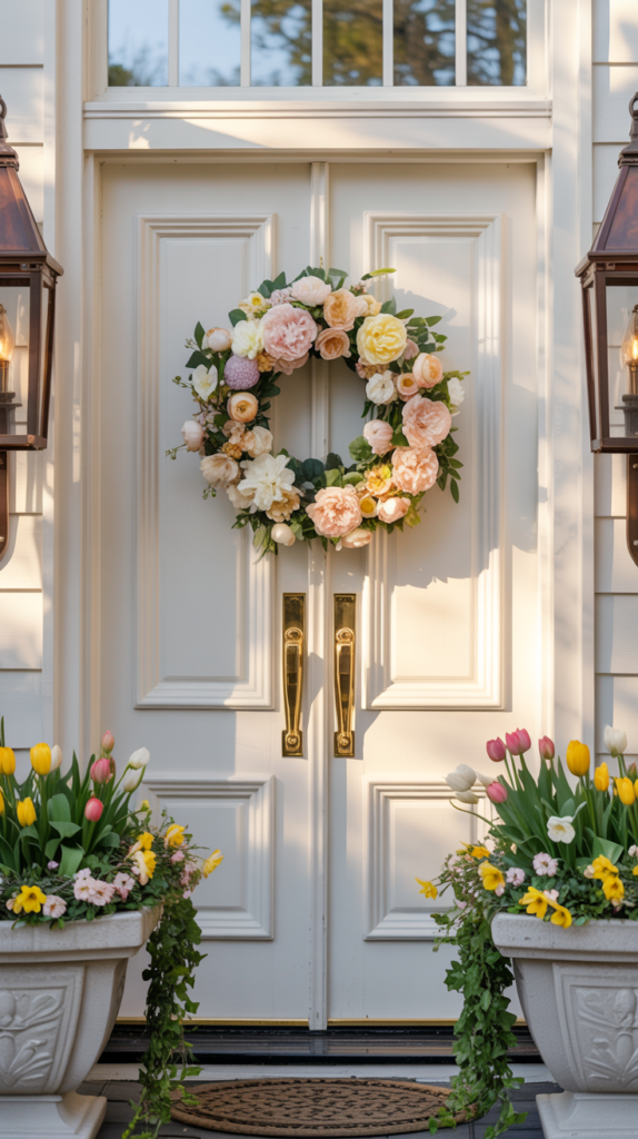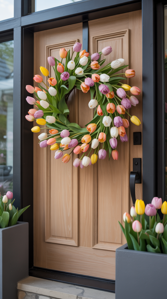 What makes this style so special is how polished it still looks, even with all that color. Tulips have a clean, elegant shape, so when they’re arranged tightly around a wreath base, the result feels curated rather than messy. This wreath looks stunning on both modern and classic homes, adding personality without overpowering the architecture