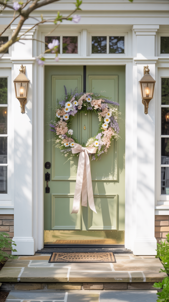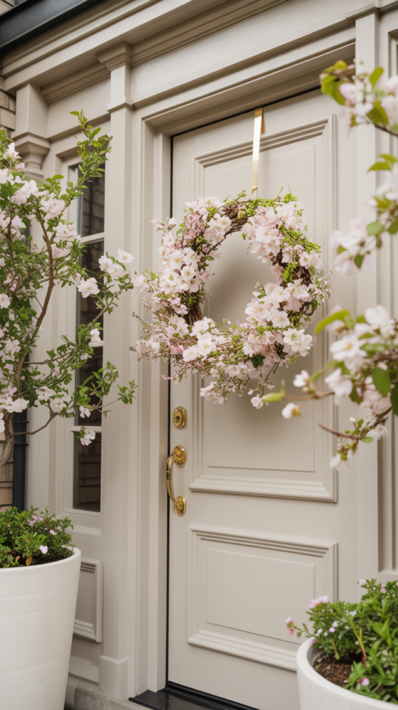 This wreath looks especially beautiful on light-colored doors, where the blush tones stand out and create a dreamy contrast. It’s a lovely choice if you prefer decor that feels elegant and graceful rather than bold. A cherry blossom wreath turns your front door into something that feels poetic and peaceful, setting the tone for a calm, beautiful home.