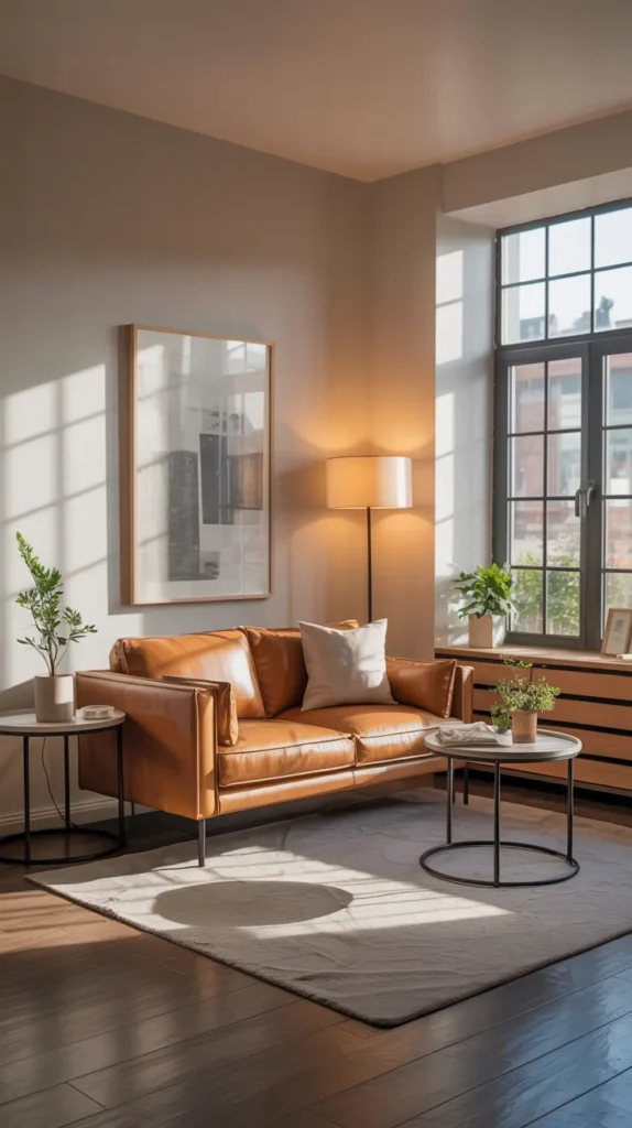 Leather seating can surprisingly improve a small apartment because it reads visually clean and structured, unlike bulky upholstery that absorbs light. A compact loveseat gives the room definition without crowding it, especially when paired with furniture that serves multiple functions. A narrow console table behind the sofa or a slim nesting table nearby adds usefulness while maintaining clear movement paths, which keeps the space feeling open.
