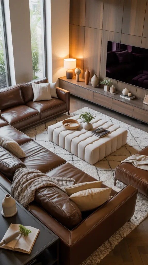 The styling around this layout should reinforce comfort rather than compete for attention. A wood or stone coffee table adds texture while soft pillows and throws prevent the leather from feeling formal. Warm lamps in the evening deepen the atmosphere so the room works equally well day or night. When balanced correctly, the living room feels welcoming and intimate — a place designed for conversation and rest rather than simply displaying furniture.
