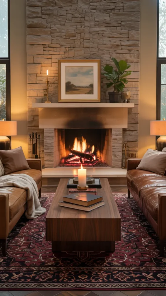 17. Fireplace-Centered Layout Around a Leather Sofa