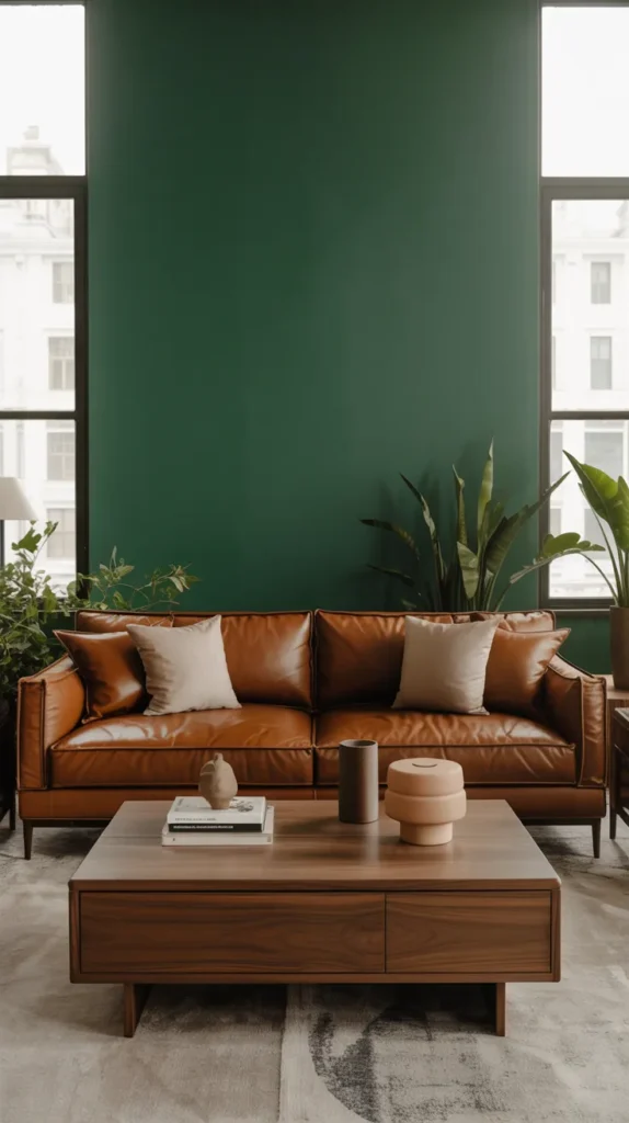 20. Green Accent Wall Paired With Brown Leather Sofa