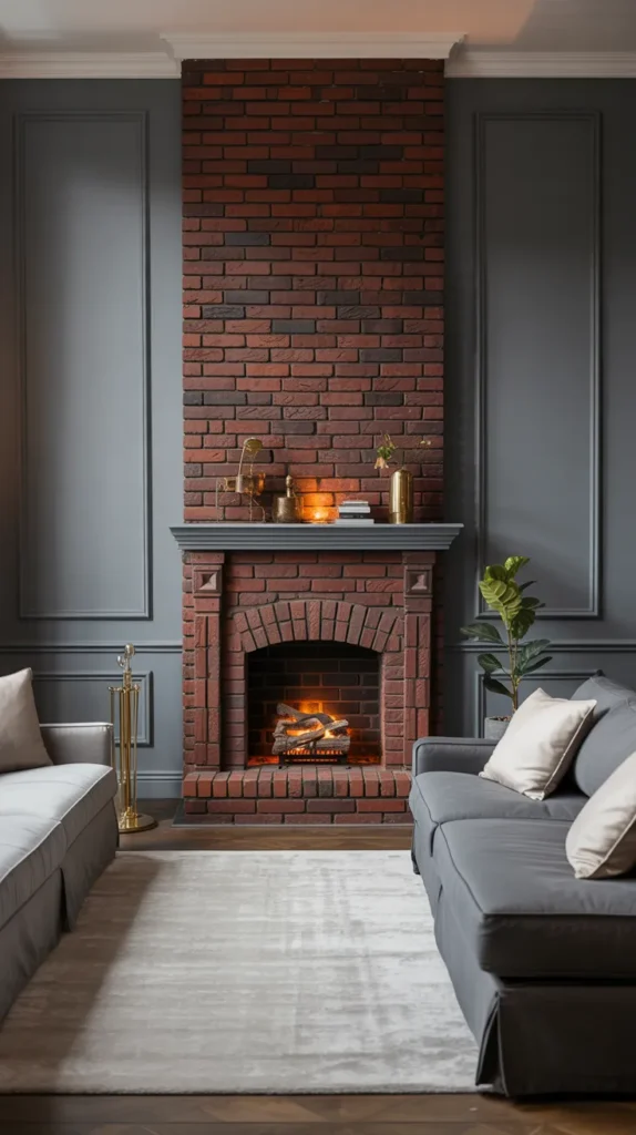 red fireplace feature instantly becomes the focal point of a grey living room, adding architectural interest and visual warmth. Whether it’s exposed red brick or a painted muted red finish, the contrast against grey walls or a grey surround creates a striking but timeless look.