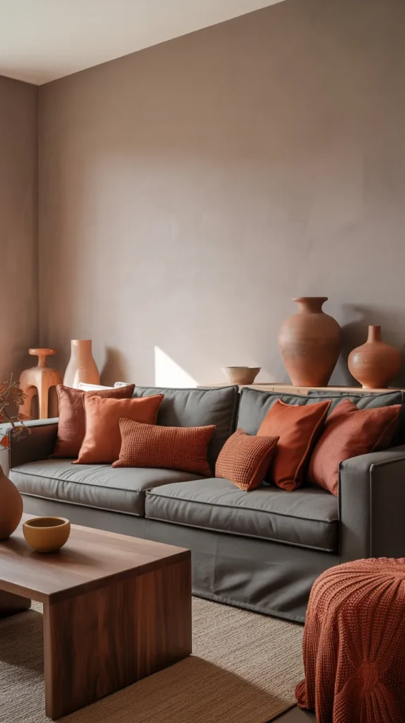 13. Matte Grey Living Room with Muted Terracotta Red Decor