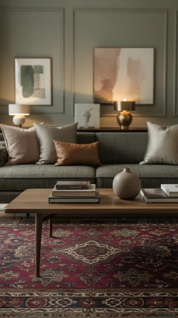 To keep the room from feeling too traditional, balance the rug with clean-lined furniture and minimal decor. A simple grey sofa, streamlined coffee table, and understated lighting allow the rug to shine without overwhelming the space. The result is a living room that feels layered, intentional, and effortlessly stylish rather than overly decorated.