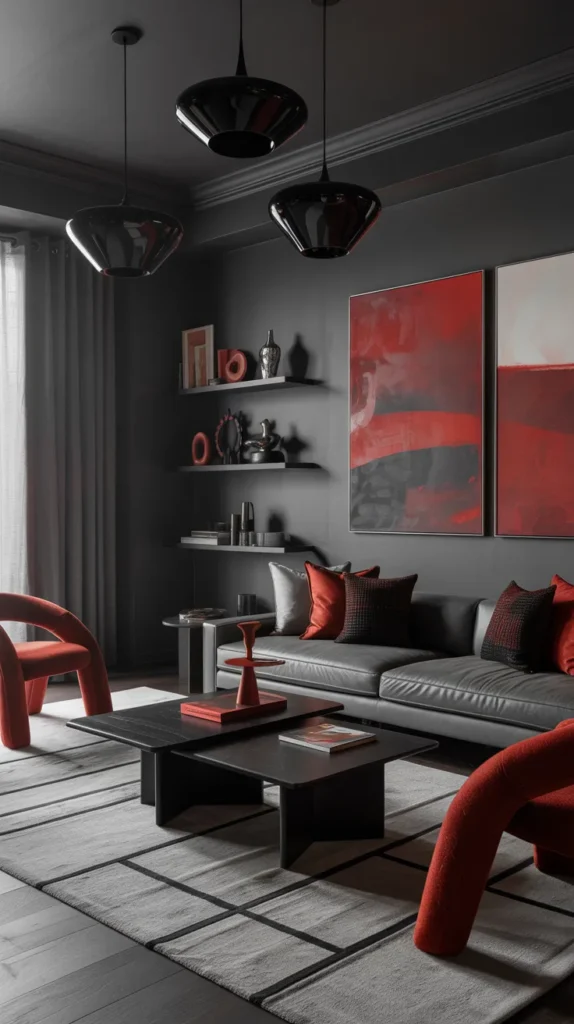 The key is proportion. Let grey dominate large surfaces, use black for structure through furniture or lighting, and introduce red in controlled doses through accent chairs, art, or textiles. This balance creates a living room that feels edgy, fashion-forward, and surprisingly livable.