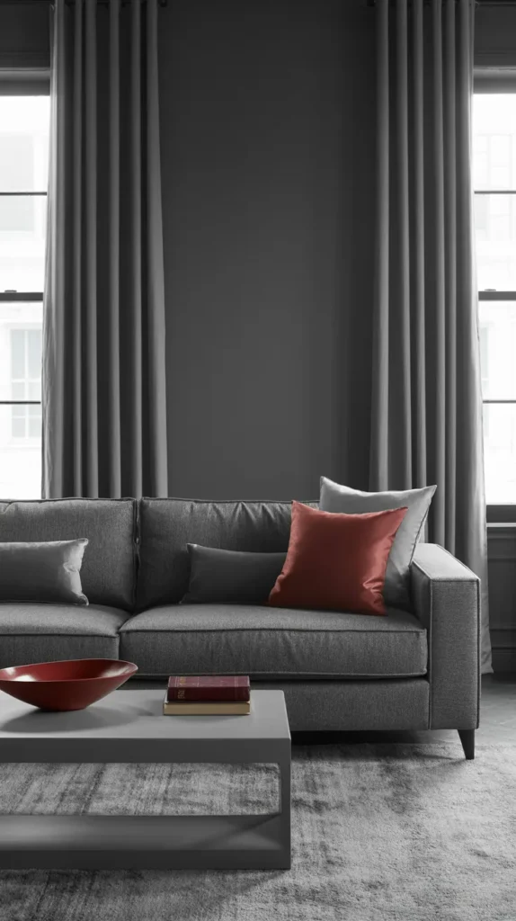 9. Monochrome Grey Living Room with Subtle Red Highlights
