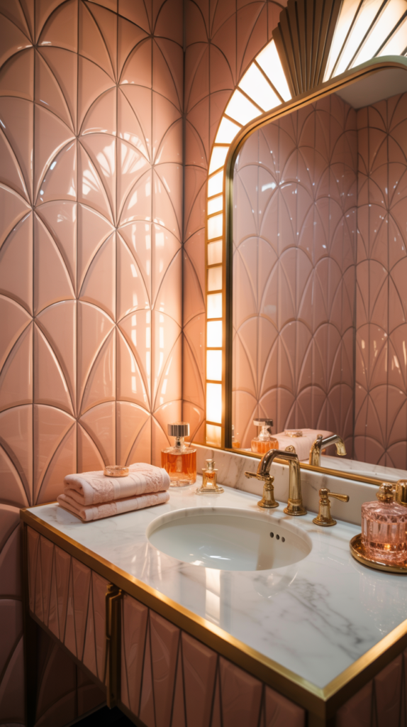What makes this design so magical is the way it balances boldness with softness. The strong Art Deco lines give the room structure and elegance, while the pinks and warm metallics keep it feminine and inviting. Add a statement mirror, a beautiful light fixture, and a few chic accessories, and suddenly your bathroom feels like it belongs in a luxury boutique hotel. It’s perfect for anyone who loves glamour but still wants their space to feel warm and pretty rather than dark or heavy.