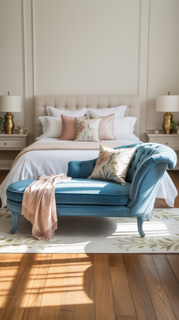 There’s something irresistibly elegant about a velvet chaise lounge in a bedroom. It instantly brings that old-Hollywood, luxury-hotel feeling into the space — like your room was designed for lounging, not just sleeping. The soft sheen of velvet catches the light beautifully, adding depth and richness, while the long, curved shape of a chaise makes the room feel more romantic and relaxed. Whether it’s in a deep jewel tone or a soft blush, a velvet chaise creates a statement without overwhelming the space.