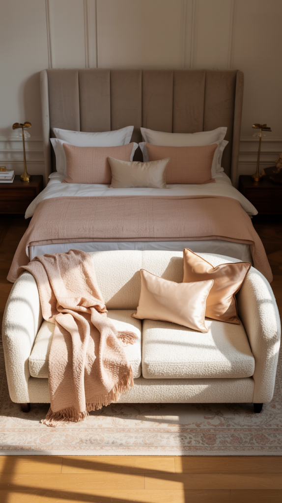 What makes this kind of sofa especially beautiful in a bedroom is how effortlessly it blends into the space. It doesn’t compete with the bed — it complements it. Placed at the foot of the bed, under a window, or along a wall, it creates a cozy spot to sit, lay out outfits, or enjoy a quiet moment. The soft upholstery and simple shape give the room that refined, high-end look that feels stylish without trying too hard.