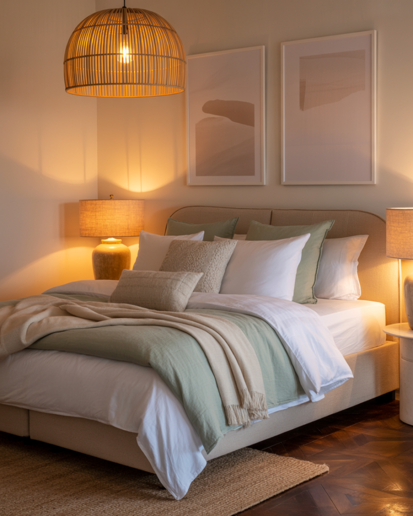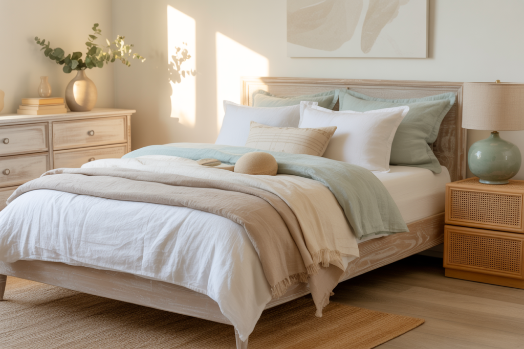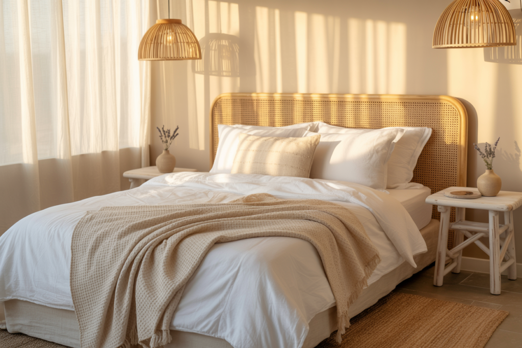 • Rattan or cane accents: Whether it’s a nightstand, chair, or headboard—these pieces add warmth and texture.