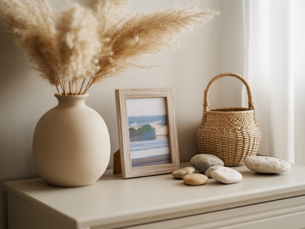 • Framed coastal prints: Think waves, dunes, shells—not cheesy stock photos