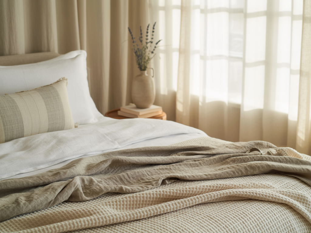 • Linen or cotton bedding: Breathable, soft, and yes, a bit wrinkly—but in a chic, I-don’t-try-too-hard kind of way.